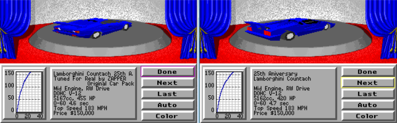 | current | 17:33, 13 June 2025 | 1,547 × 480 (119 KB) | Zapper (talk | contribs) | Zapper's Car Pack - Lamborghini Countach 25th Anniversary - new back showroom (CAR0) comparison with original car |